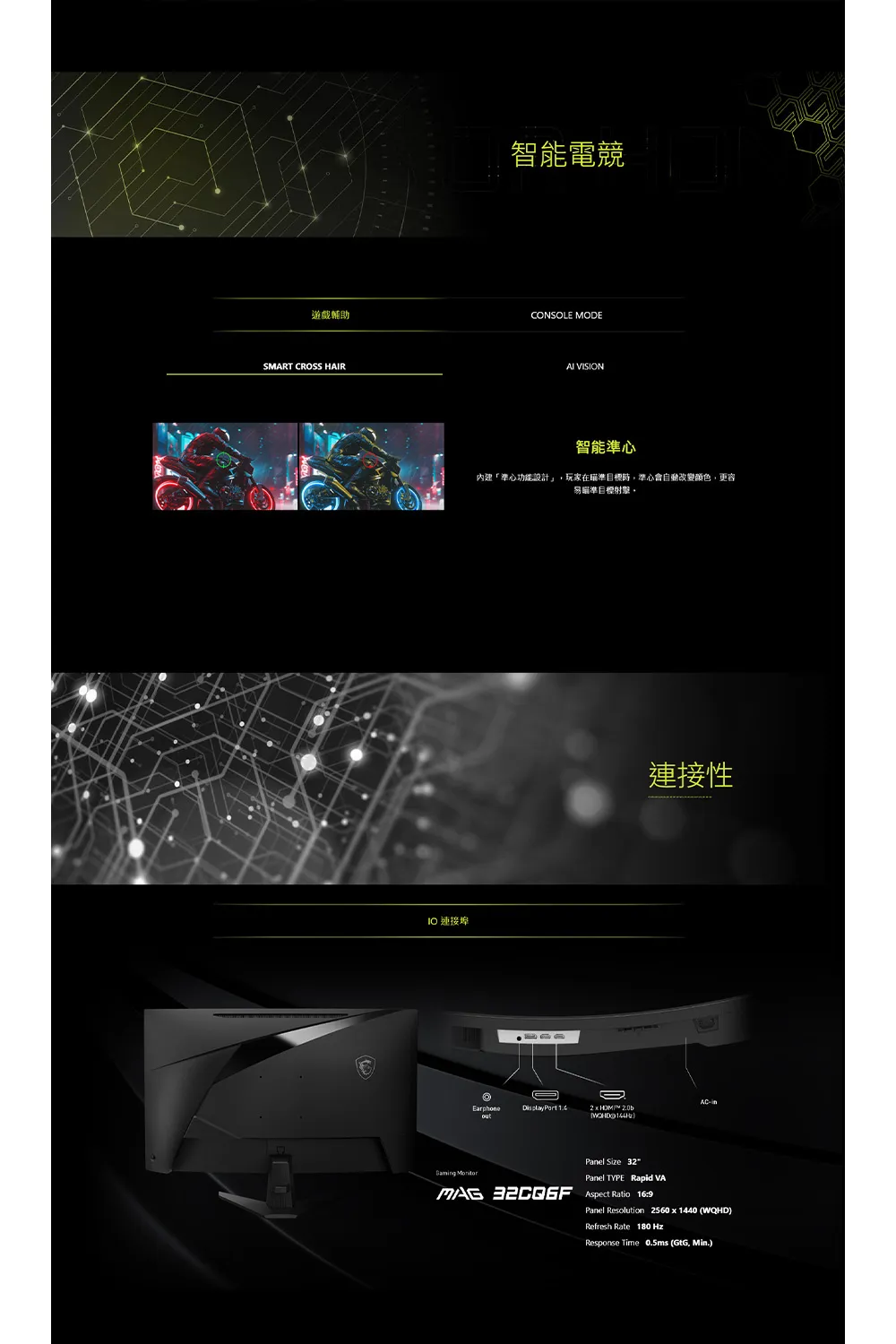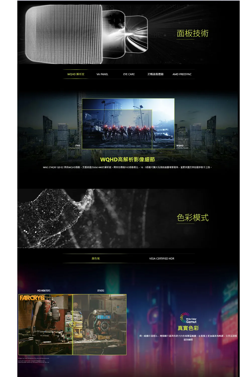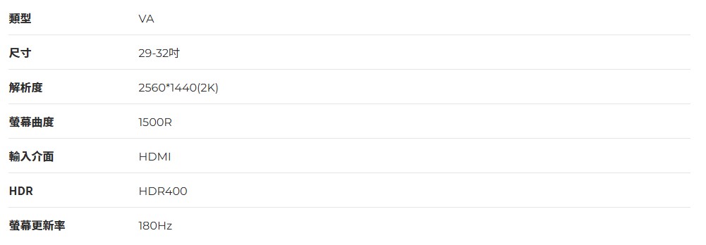面板尺寸 31.5″ (80.01 cm) 顯示區域(MM) 697.344 (H) x 392.256 (V) 曲面螢幕 Curve 1500R 面板類型 Rapid VA 最佳解析度 2560 x 1440 (WQHD) 像素 (H x V) 0.2724(H) x 0.2724(V) 螢幕比例 16:9 亮度 400 (Typ.) 靜態對比度 3500:1 (Typ.) 動態對比度(DCR) 100000000:1 訊號頻率 70.08~266.4KHz(H) / 48-180Hz(V) 更新頻率 180Hz 反應時間 0.5ms (GtG, Min.) 動態刷新率技術 AMD FreeSync™ 支援HDR DisplayHDR 400 影像連接埠 1 x DisplayPort 1.4 (HBR2) 2 x HDMI™ 2.0b (WQHD@144Hz) 音頻接孔 1 x Headphone Out 可視角度 178° (H) / 178° (V) Adobe RGB / DCI-P3 / sRGB 82% / 78% / 101% 表面處理 Anti-Glare 色彩顯示 1.07B , 10 bits (8 bits + FRC) 電源輸入 100 ~ 240V, 50/60Hz 肯辛頓鎖孔 Yes 尺寸 (寬X深X高) 709.4 x 507.2 x 249.8 mm 709.4 x 419.1 x 107.2 mm(不含支架) 紙箱尺寸 (寬X深X高) WW Carton: 800 x 170 x 514mm Outer: 818 x 188 x 549mm 窄邊框設計 Yes VESA安裝 100 x 100 mm 刷新率範圍 48~180Hz 調整 (仰角) -5° ~ 20° 重量 (NW / GW) 5.3kg / 8.4kg 4.9kg(不含支架) 備註 Display Port: 1920×1080 (Up to 180Hz) HDMI™ 2.0: 1920×1080 (Up to 180Hz) *Adobe RGB, DCI-P3 and sRGB follow CIE1976 Standard